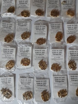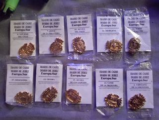 Conjunto de 37 insignias de la provincia de Cádiz, cada una presentada en su envoltorio individual. - Colección de insignias. - Cada insignia viene empaquetada.