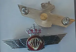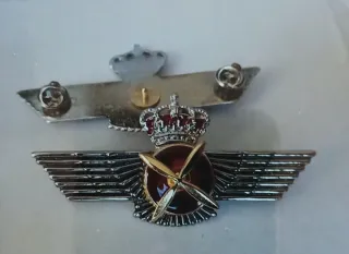 Insignia metálica de piloto militar con corona real y hélice. - Diseño detallado de alas. - Corona plateada con detalles rojos. - Hélice dorada central.