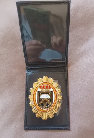Insignia metálica de la Brigada Paracaidista. - Diseño circular con borde dorado. - Incluye corona real y paracaídas. - Texto BRIGADA y PARACAIDISTA.