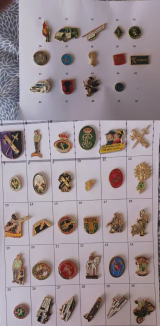 Lote de 44 pines o insignias metálicas. - Pin 31: Guardia Civil con bandera. - Pin 32: Furgoneta Guardia Civil Tráfico. - Pin 33: Cañón Guardia Civil. - Pin 34: Rombo Guardia Civil. - Pin 35: Insignia circular Guardia Civil. - Pin 36: Insignia circular Protección Natural. - Pin 37: Balanza azul. - Pin 38: Figura religiosa. - Pin 39: Insignia roja con cruces. - Pin 40: Insignia rectangular Guardia Civil.