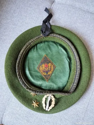 HAGO ENVÍOS, PREGUNTAR Boina que por la insignia de alfiler de primera producción (lisa sin relieve) y la construcción de la boina (sin el alza rígida interior) corresponde a uno de los primeros modelos. Con estrellas de Teniente, en color verde guerrillero y con forro interior verde esmeralda; aunque el sudadero y las infulas estaban establecidas tambien en color verde, no es inusual encontrarlas en color negro, tanto en esta marca como en otras como La Encartada. conservada en buenas condiciones , de la afamada casa Elosegui, no trae talla marcada pero viene a ser una 58.