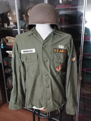 Camisa o camisola OG107 utilizada en el US Army en los años 50-60, desde la guerra de Korea hasta principios de la guerra de Vietnam. Con insignias de tropas paracaidistas, concretamente de unidades Pathfinder, galones de soldado especialista y etiqueta de talla (una 15 1/2, que viene a ser una M, aunque cuelgo fotos adicionales con las medidas) Conservada en buenas condiciones, aunque con el desgaste típico de su época y un par de manchas de oxido en el bolsillo derecho.