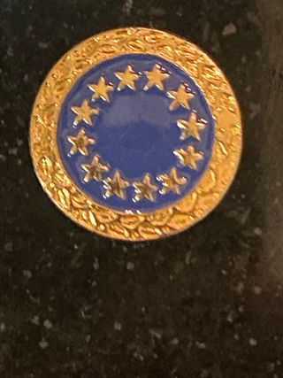 Material y uso: Está fabricado en metal, probablemente latón o un material similar con un acabado esmaltado, y se sujeta mediante un alfiler o pin. Es un artículo común de coleccionismo o para mostrar apoyo a la Unión Europea. 1,5 cm. Peso aproximado 2,45 gramos