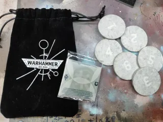 - Insignia de Warhammer 40,000 con logo de los Ultramarines y Necrones. De regalo: Set de accesorios para Warhammer 40,000. - Bolsa negra con logo de Warhammer 40,000. - Marcadores circulares numerados del 1 al 6.