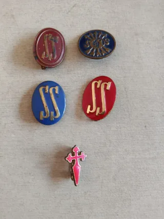 Conjunto de insignias antiguas del Servicio Social. - Insignia ovalada azul con letras doradas. Fecha aproximada 1928 - Insignia ovalada roja con letras doradas. Fecha aproximada 1928 - Cruz de Santiago esmaltada en rojo. Fecha aproximada 1928 - Insignia ovalada roja con letras doradas. Fecha aproximada 1967 - Insignia ovalada azul con diseño radial. Fecha aproximada 1967