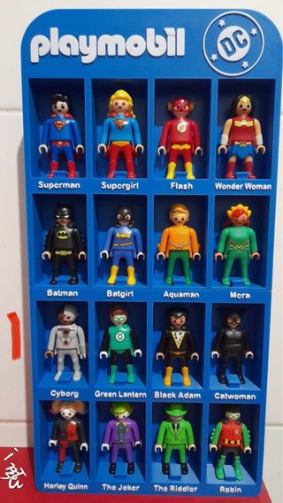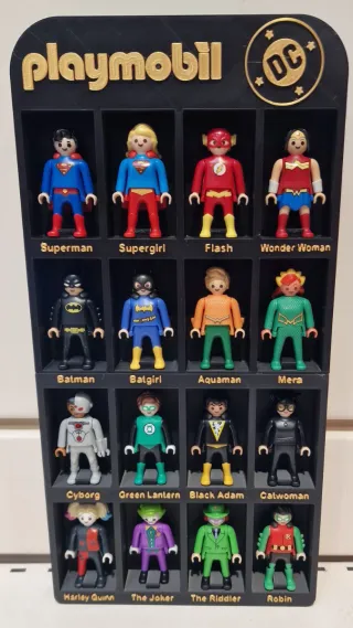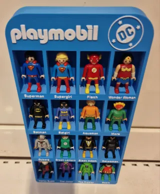 Expositor para la colección de figuras de DC de Playmobil de los huevos Kinder! Cada huequito con su nombre, el logotipo de DC y el de Playmobil!! Hecho en 3D NO INCLUYE MUÑECOS!!