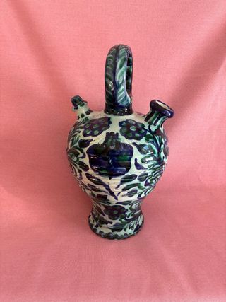 La pieza de cerámica es un botijo de Fajalauza, un estilo de cerámica tradicional de Granada, España. Se caracteriza por sus esmaltes en tonos verdes y azules. Las decoraciones comunes incluyen motivos florales, como azucenas, y pájaros. Altura 36 cm Anterior a los años 70 Estado ver fotos