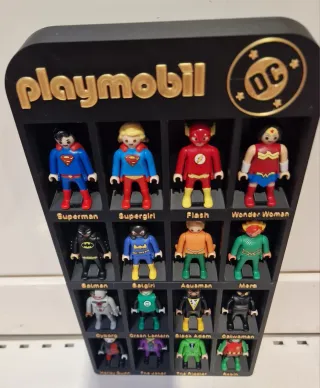 Expositor para la colección de figuras de DC de Playmobil de los huevos Kinder Cada huequito con su nombre, con el logo de DC y el de Playmobil! Hecho en 3D NO INCLUYE MUÑECOS!!!