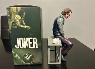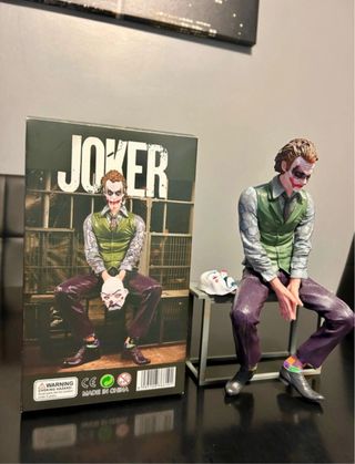 Figura coleccionable del Joker, interpretado por Heath Ledger. - Detallado diseño del personaje. - Incluye máscara de payaso. - Banco de exhibición. - Caja ligeramente dañada. - Medidas 25 alto x 16 ancho