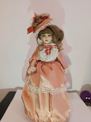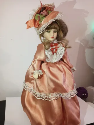 Preciosa muñeca de porcelana vestida con un elegante traje de época en tono melocotón y encaje blanco, con unos pantalones blancos por debajo. Lleva un sombrero a juego adornado con flores y lazos y sus zapatitos blancos. También tiene su soporte para estar depie. Contiene una llamave a su espalda, que al girar reproduce la canción Für Elise de Beethoven. - Detalle de lazo y volantes en el vestido. - Expresión facial delicada. - Melena castaña recogida.