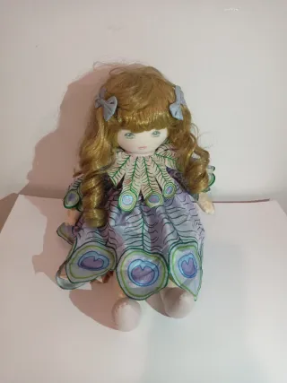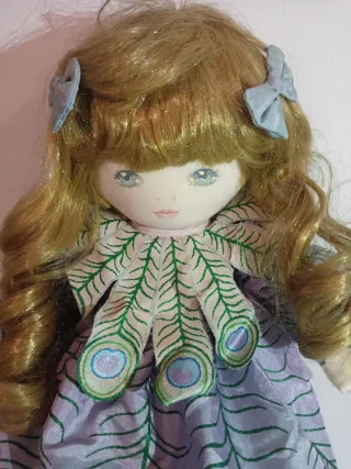 Adorable muñeca de trapo con un bonito vestido. - Vestido con estampado de pavo real. - Detalles en tonos verdes y morados. - Lazos en el pelo.