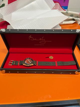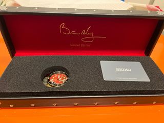 Reloj Seiko Sports Edición Limitada Brian May Red Special 2 - Esfera de color naranja. - Correa de tela estilo Nato en dorado y negro. - Bisel giratorio negro y rojo. - Caja de presentación con firma y detalles dorados.