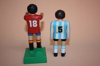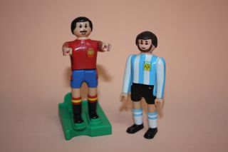 Figuras de Airgam Boys representando a las selecciones de España y Argentina. Algún zapato abierto. Se vende tal y como aparece en las imágenes, fijarse en ellas pues son parte de la descripción. Para cualquier duda, preguntar antes de comprar, sin problemas. - Jugador con camiseta roja y escudo. - Jugador con camiseta a rayas celestes y blancas y escudo. - Base verde para uno de los jugadores.