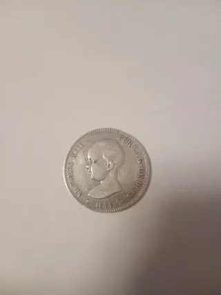 Moneda de plata de 5 pesetas del año 1888, con el busto de Alfonso XIII. - Material: Plata. - Año: 1888. - Denominación: 5 Pesetas. - Anverso: Busto de Alfonso XIII. - Leyenda: ALFONSO XIII POR LA S.G.DE DIOS