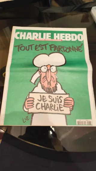 Ejemplar original del periódico satírico Charlie Hebdo, con la icónica portada Tout est pardonné,del año 2015. -primera edición especial que sacaron después del atentado contra la sede del periódico en París. -periodico completo y sin leer,tal como se compró en Francia (Hendaya), pocos ejemplares.