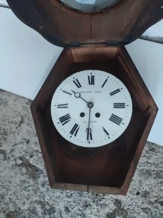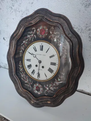 Precioso reloj francés del siglo XIX c. 1860 - Marco de madera con forma ondulada. - Decoración con incrustaciones de nácar y detalles en rojo. - Esfera con números romanos y agujas doradas.