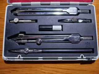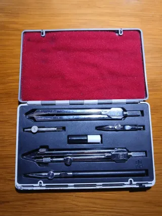 Estuche de compás de precisión vintage. Incluye varias herramientas para dibujo técnico. - Compás principal con accesorios. - Compás secundario. - Lápiz de grafito y minas.