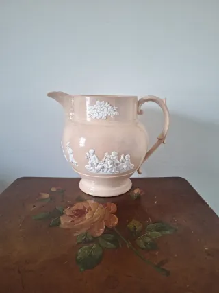 PRECIO NO NEGOCIABLE. GRACIAS Artículo Excepcional! Antigua y rarísima Jarra de colección, en Terre de fer color rosa, de la Manufactura David Johsnton Bordeaux. Francia. Diseño clásico y elegante con querubines y flores en relieve. Datada entre 1835-1845 LAS FOTOS SON LA MEJOR DESCRIPCIÓN. Mírelas atentamente. Buen estado general. Zonas de desgaste, propias de una pieza de más de 180 años. Medidas: Altura máxima 19,2 cm. Aprox. Anchura asa y pico incluidos 23,5 cm. Aprox. Para más fotos y videos visita mi Instagram lolasevadepulgas. Gracias No se reserva