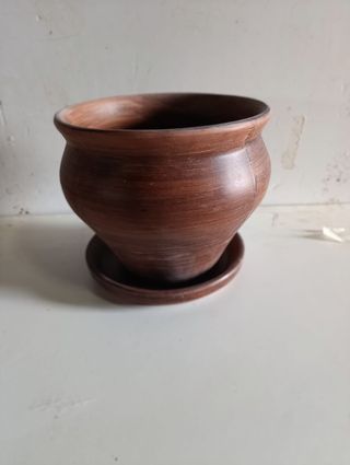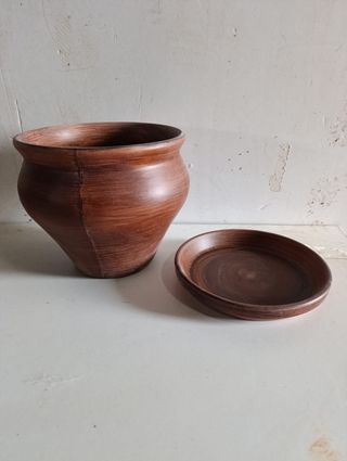 Conjunto artesanal de alfarería en barro, formado por un cuenco grande y un plato a juego. Ambos están decorados con un acabado efecto madera, muy vistoso y cálido para decoración rústica o natural. • Cuenco: 25 cm de alto y 28 cm de boca aprox. • Plato: 27 cm aprox. • Material: Barro artesanal • Acabado: Efecto madera • Estado: Bueno, con detalles propios del trabajo manual Precio del conjunto: 22 € Perfecto para decoración, cocina tradicional o como pieza artesanal única.
