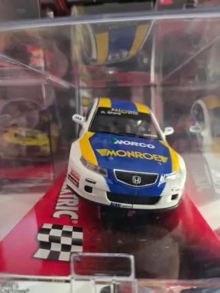 Coche de slot Scalextric con decoración de competición. - Modelo R. Sharp. - Número de dorsal 24. - Decoración con logos de NORCO, MONROE, ADVAN y YOKOHAMA. - Base roja con texto TECNITOYS y SCALEXTRIC.