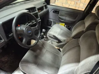 Interior de Ford Sierra 2.0 i Ghia, 5 puertas. Inyección electrónica (EFI). Motor DOHC - Asientos delanteros de terciopelo gris. - Volante negro. - Palanca de cambios.