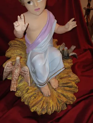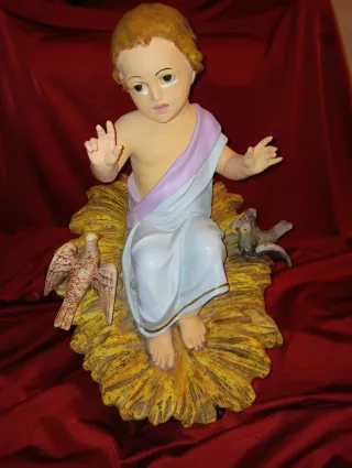 Figura de Niño Jesús en un pesebre, de los talleres Olot. Es raro de encontrar. Gran tamaño, mide 50 cm en total. El Niño jesus se encuentra completo, no tiene ninguna pérdida, aunque presenta repintes. El pesebre mantiene su policromia original.