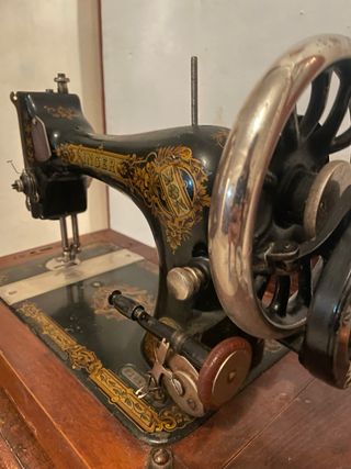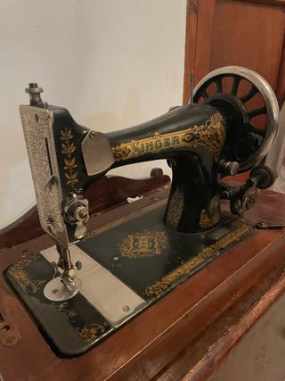 Máquina de coser SINGER de manivela, un modelo clásico con detalles ornamentales. Está completa (manivela, volante, prensatelas, tapa). No restaurada, tal cual la dejaron mis abuelos y con el desgaste normal por los años. Características concretas: • Marca: Singer • Origen: Manufactured in Great Britain (lo pone en el brazo) • Época: aprox. 1900–1920 • Tipo: mecánica, accionada a mano (manivela) • Decoración: calcas doradas originales (bastante bien conservadas) • Mueble: base de madera con tapa abatible original