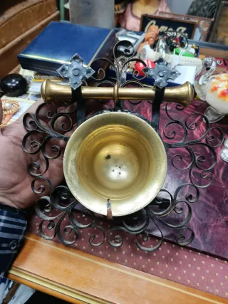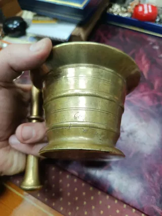 Almirez de bronce con mano y almirecero de forja granadina que se hacía tradicionalmente en el barrio del Sacro monte de Granada. Original de época, años 20-30. Mide 24x23x9 cm.Pesa 1050 gramos. Se puede recoger en mano en Jaén capital Antigüedades Rivera