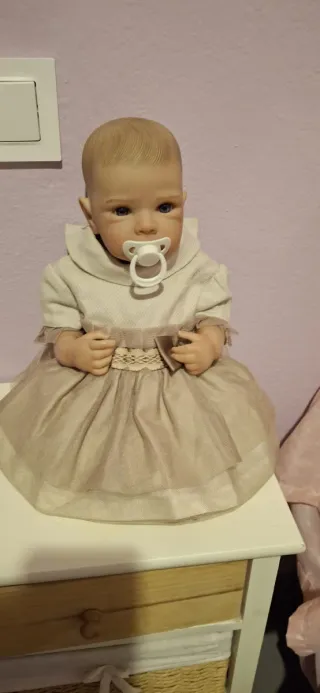 Muñeca realista de vinilo con detalles de bebé. - Cuerpo de vinilo. - Incluye chupete y vestido.