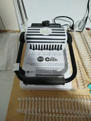 Encuadernadora Cinch de Heidi Swapp, ideal para proyectos de manualidades y scrapbooking. - Diseño compacto y fácil de usar. - Incluye 11 anillas completas y algunos trozos, de diferentes grosores. - Incluye medidor de anillas de craftelier (antigua mi tienda de arte) Tiene muy poco uso y funciona oerfectamente