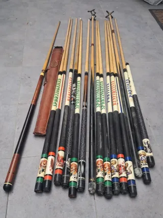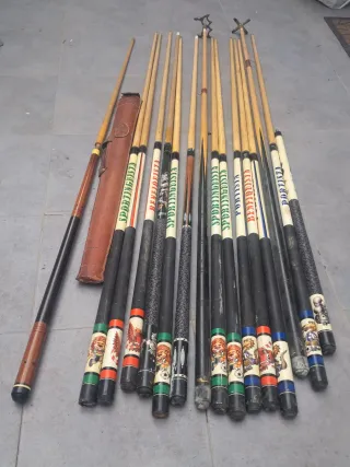 Conjunto de tacos de billar de madera, algunos con diseños. - Tacos de madera. - Funda de cuero para tacos. - Diseños variados en algunos tacos.