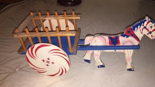 Carretilla de juguete antigua con un diseño clásico. - Estructura principal de metal pintado en verde. - Dos mangos de madera. - Rueda delantera dorada con radios.