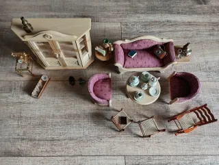 Conjunto de muebles de salón-comedor para casa de muñecas en miniatura. Incluye varios elementos decorativos y de mobiliario. - Sofá a rayas rosas y blancas. - Sillón a juego x2 - Mesa redonda con servicio de té. - Armario vitrina de madera. - Teléfono antiguo dorado. - Revistero - Sillas de madera. - Mecedora. - Accesorios decorativos como jarrones y libros.