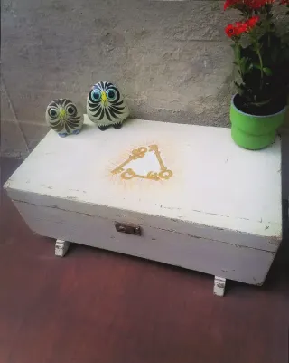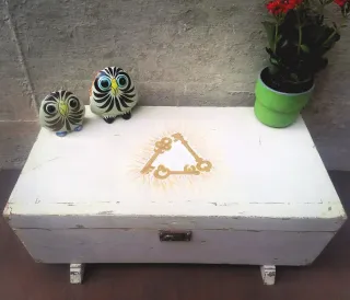 MAGIA GARANTIZADA con lo que guardes en este cajón antiguo de madera con cerradura, que hemos PERSONALIZADO en mix de blancos, ENVEJECIDO y luego DECORADO con DISEÑO EXCLUSIVO de llaves doradas e interior en rojo. 55 x 29 x 22 @vintage bohemio regalo especial guardador secreto ropa interior juguetes herramientas maleta mago masonería símbolos