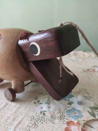 Hipopótamo de madera ,con ruedas ,años 70 ,figura con ruedas y cuera para llevar de paseo rodando