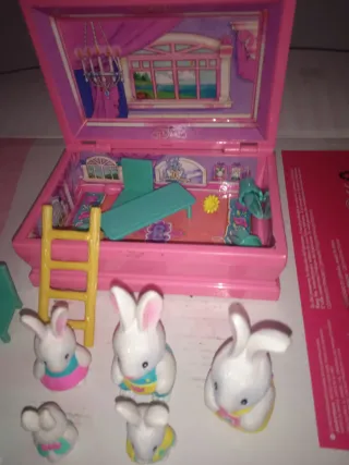 Conjunto de figuras y accesorios de la marca Takara, modelo Family de 1993. - Incluye varias figuras de conejos. - Contiene una casa de juguete plegable. - Accesorios como escalera y muebles.