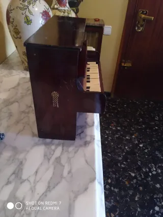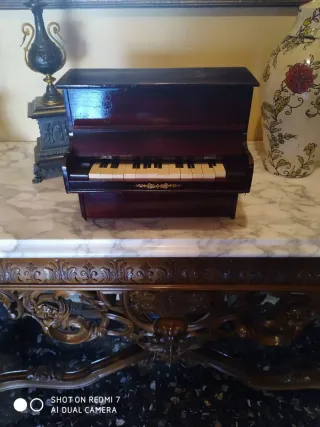 Precioso piano de juguete antiguo, fabricado en madera oscura con acabado brillante. Ideal como pieza decorativa. Hay una tecla que no va - Teclas blancas y negras. - Detalle dorado en el lateral.