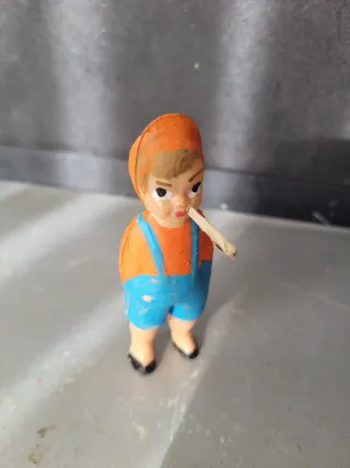 Este es un muñeco de madera con un diseño clásico, similar a Pinocchio. Es una pieza decorativa con un encanto vintage. - Fabricado en madera. - Detalles pintados a mano. - Colgante para exhibir.