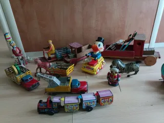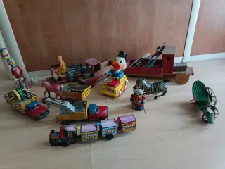 Colección de juguetes antiguos de diferentes tipos. - Varios vehículos de juguete como camiones y trenes. - Figuras de personajes como Donald y un payaso.