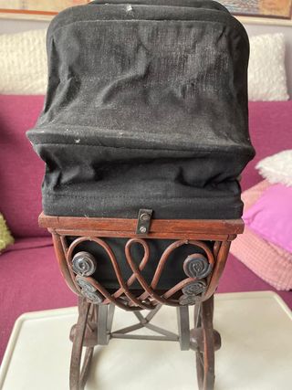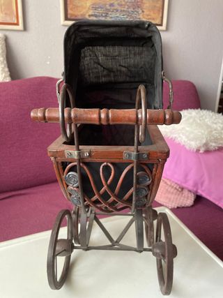 Este carrito de muñecas decorativo tiene un diseño vintage y encantador. - Estructura de madera y metal. - Detalles de cestería. - Capota de tela negra. Juguete decorativo que simula un cochecito de bebe antiguo de finales del siglo XIX. Medidas: Alto 50 cm, largo 38 cm, ancho 20 cm, medidas ene el interior ancho 13,5 cm, largo 26 cm, profundo 10,50 cm