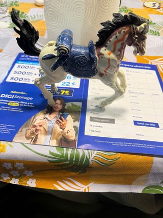 Figura de caballo de juguete con un diseño inspirado en motivos indios. - Detalles pintados a mano. - Silla de montar y adornos. - Cola y crin detalladas. Se envia