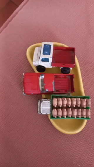 Lote de tres coches antiguos de juguete. - Camión blanco y rojo. - Camioneta roja. - Coche blanco con remolque de cerditos.