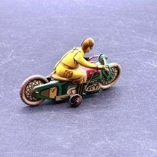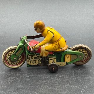 Moto de hojalata vintage, un juguete clásico de los años 40. Su diseño detallado evoca la nostalgia de épocas pasadas. - Fabricada en hojalata. - Diseño de motociclista con casco y gafas. - Ruedas con detalles gráficos. - Incluye su llave de cuerda.