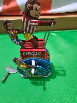 CERDITO DE HOJALATA CON PLATILLOAS el muñeco camina y los platillos giran a cuerda. Es un juguete encantador y peculiar. - Juguete de hojalata con diseño de mono. - Mecanismo de ruedas giratorias. - Pintado a mano con colores llamativos. - Perfecto estado de conservación.