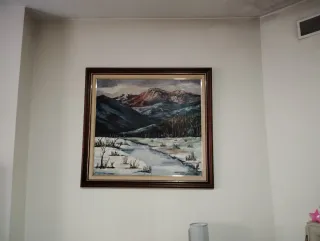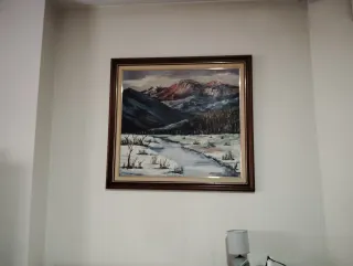 Lienzo pintado a paleta al oleo de paisaje de montaña, arboles y río con nieve.
