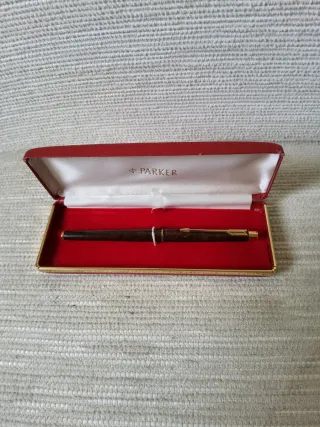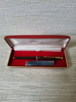 Elegante pluma estilográfica de la marca Parker, con un diseño clásico y acabado en tono marrón veteado. Presentada en su estuche original. - Marca: Parker - Color: Marrón veteado - Incluye estuche original