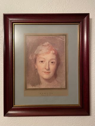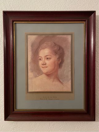 Reproducciones de retratos del artista Maurice Quentin de La Tour (M. Q. de La Tour), maestro del pastel francés del siglo XVIII. - Marcos de madera maciza, tinte caoba oscuro, con filete dorado. - Bien proporcionados y en buen estado. - Ediciones cuidadas, pensadas para difusión cultural (libro de arte, museo, editorial francesa).