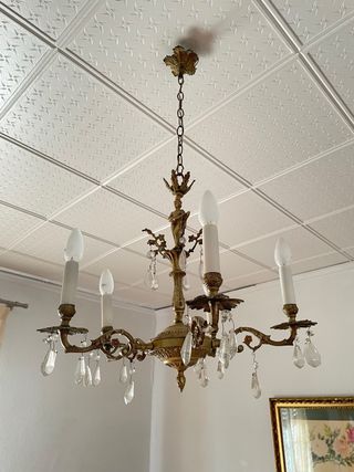 Elegante lámpara de techo antigua con un diseño clásico y detalles ornamentales. - Fabricada en bronce con acabado dorado. - Incorpora cristales decorativos colgantes. - Dispone de 4 brazos para bombillas tipo vela.