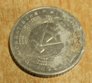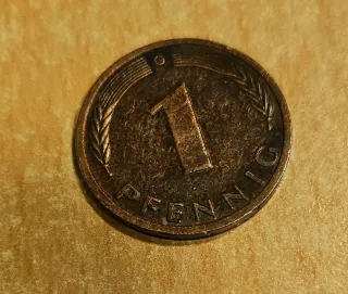 Moneda de 1 Pfennig de Alemania, año 1986. Diseño con espigas de trigo y el número 1. - Material: Cobre. - Año: 1986. - Denominación: 1 Pfennig.