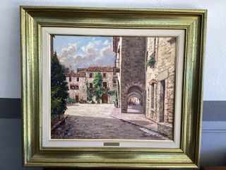 Pintura al óleo original del artista Alexandre Matas. Llum de matí Monells - Representa una escena arquitectónica con arcos y edificios de piedra. - Firmado por el artista en la parte inferior derecha. - Medidas 77x 68 cms( con marco) 56x 47 cms ( sin marco)